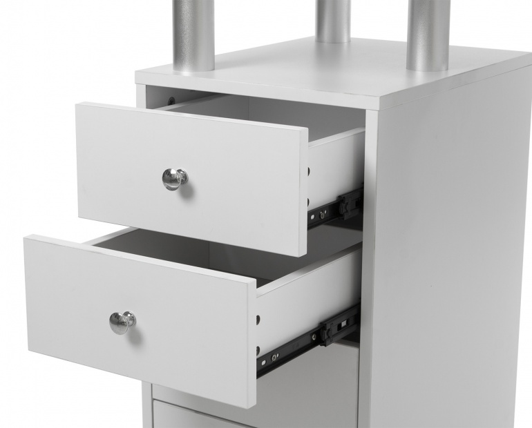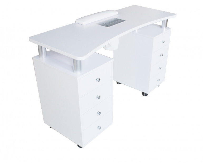Table de manucure blanche en bois avec aspirateur intégré, sac et coussin repose-mains.