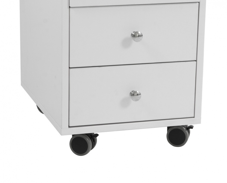 Elle est équipée d’un double caisson de rangement avec tiroirs et roulettes incluses.