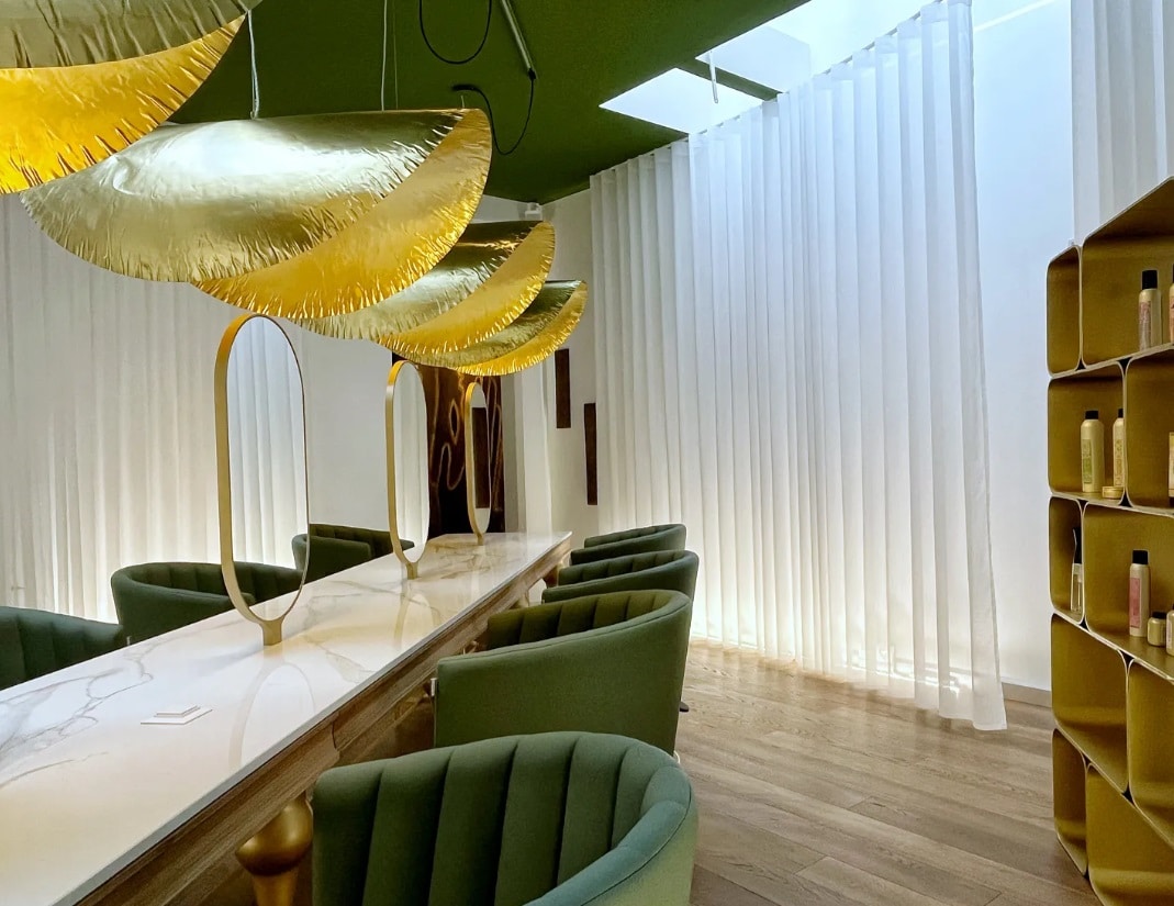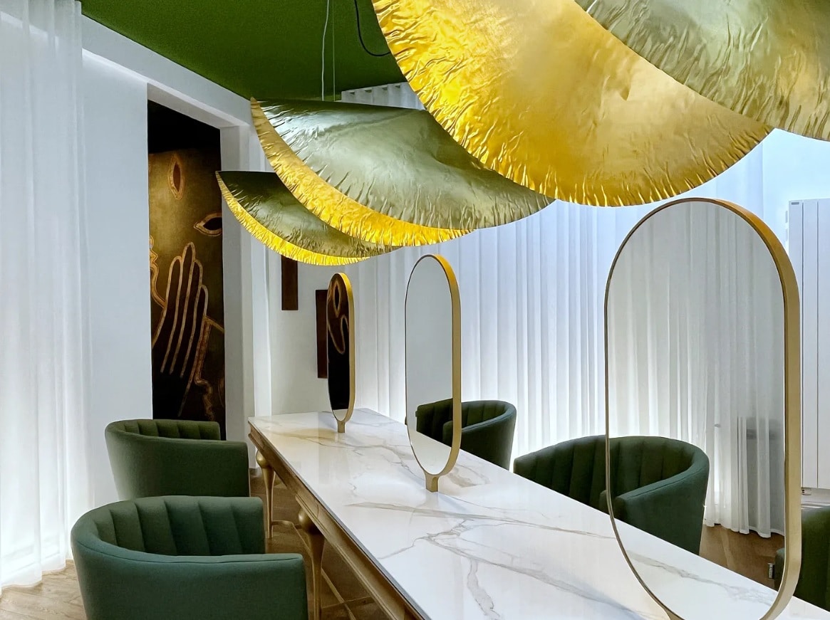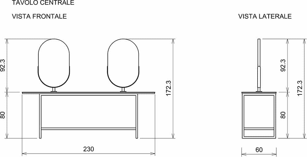 La composition à double miroir, soutenue par des cadres en acier peint en or, permet d’accueillir 4 clients à la fois, une solution parfaite pour une gestion intelligente de l’espace. Un tunnel porte-prises sous le comptoir, réalisé en stratifié plastique, complète la composition.