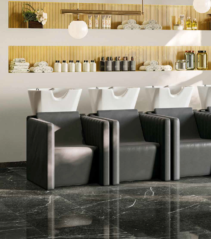 lavage Basic de la collection Fancy se compose d’un fauteuil confortable, siège idéal pour tout client en quête de style et de bien-être, et d’un salon de coiffure ultramoderne.