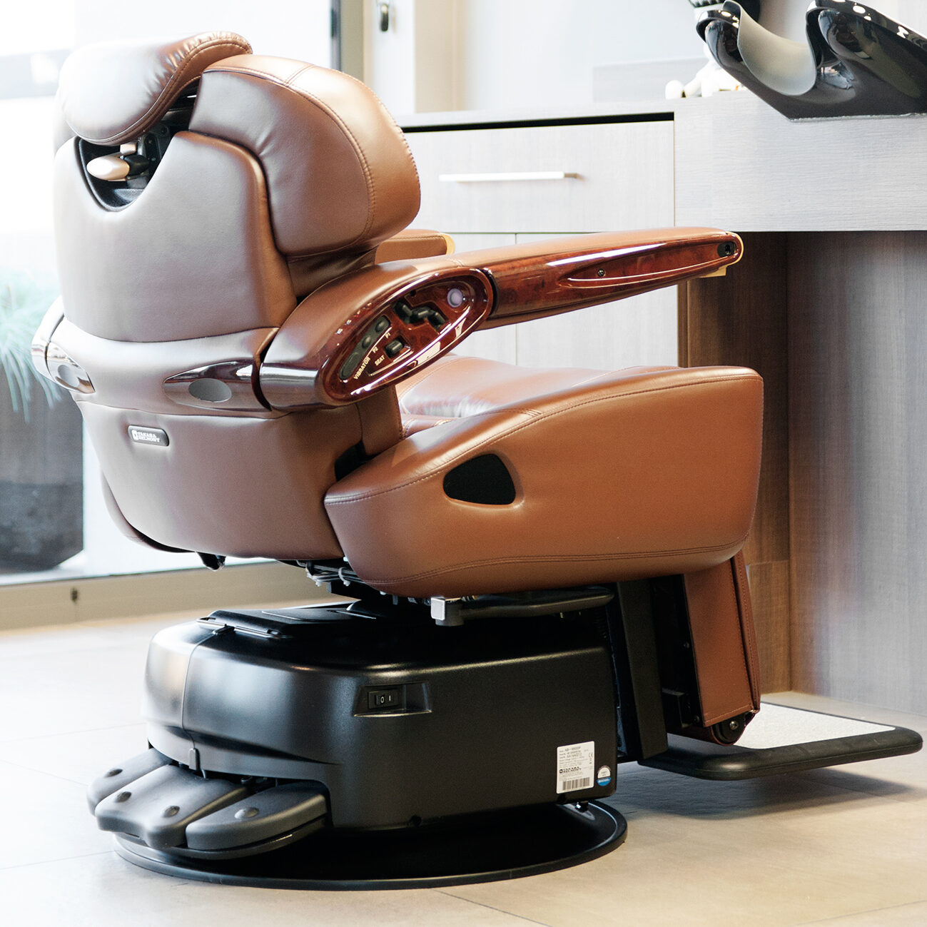 Le fauteuil est doté d’un panneau de commande de chaque côté, avec 2 réglages programmables, un retour automatique et un repose-jambes chauffant pour une expérience de luxe sans précédent.
