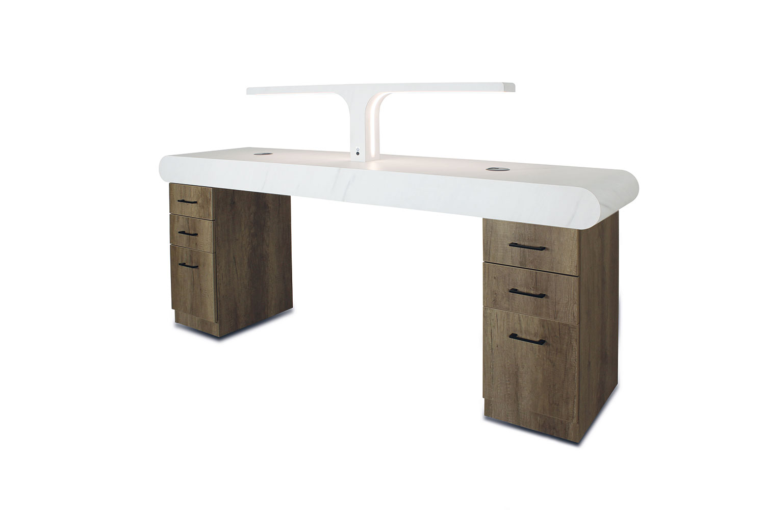 Barre lumineuse LED pratique et une surface de travail profilée résistante à l’acétone. Deux tiroirs et un placard (sur chaque position) offrent un espace de rangement précieux.