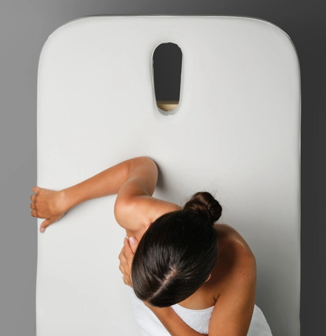 En plus son matelas d’une seule pièce se règle à 2 moteurs qui permettent d’élever non seulement le torse du patient mais aussi ses genoux pour un confort optimal pendant le traitement.