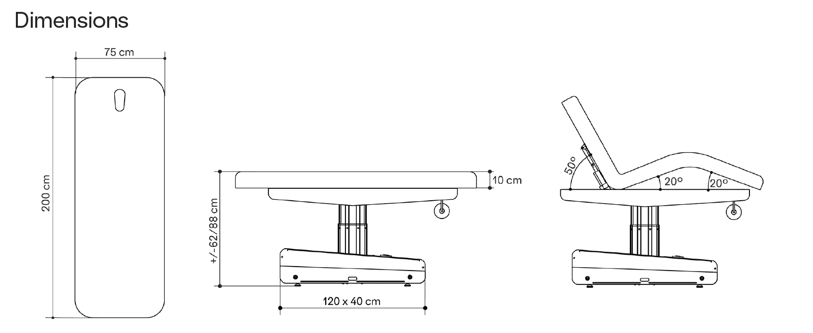 La table est équipée de 3 moteurs : un pour régler la hauteur qui atteint une position minimale de 62 cm en permettant un accès facile du patient et une position maximale de 88 cm.